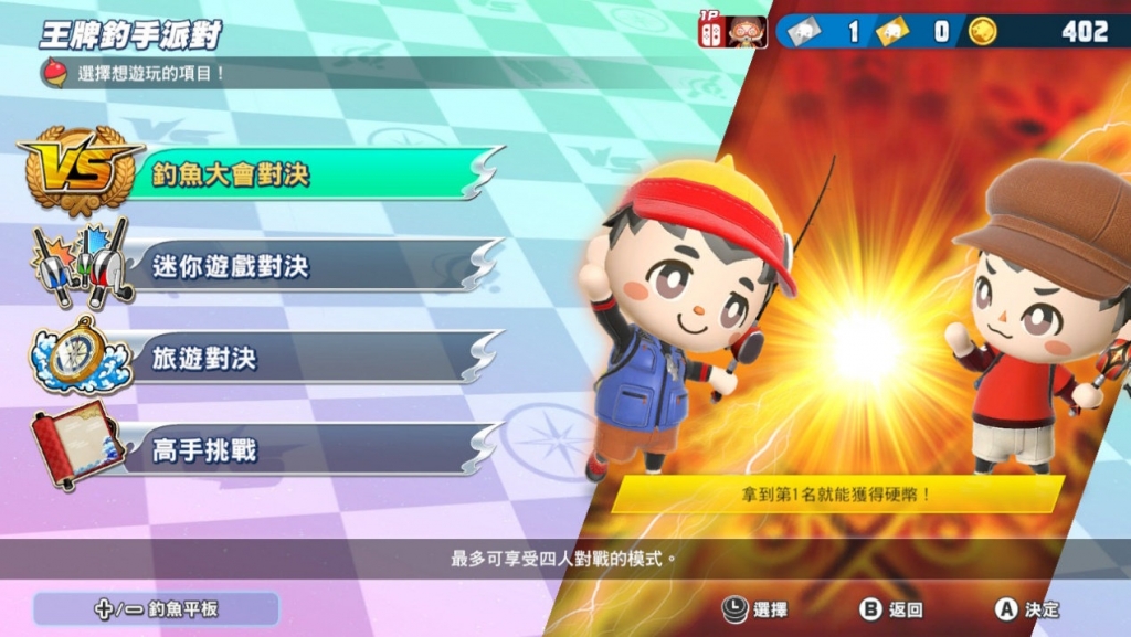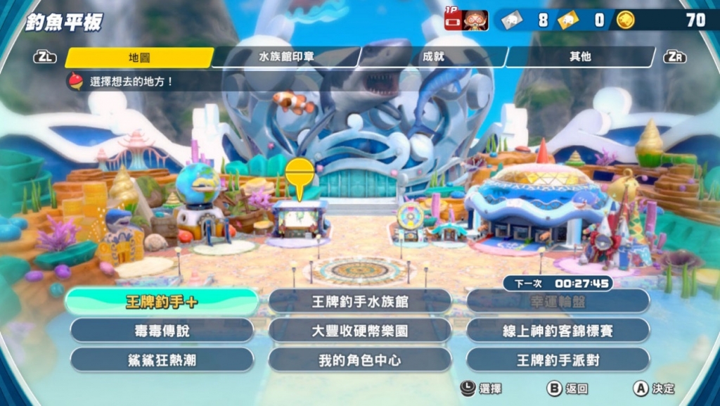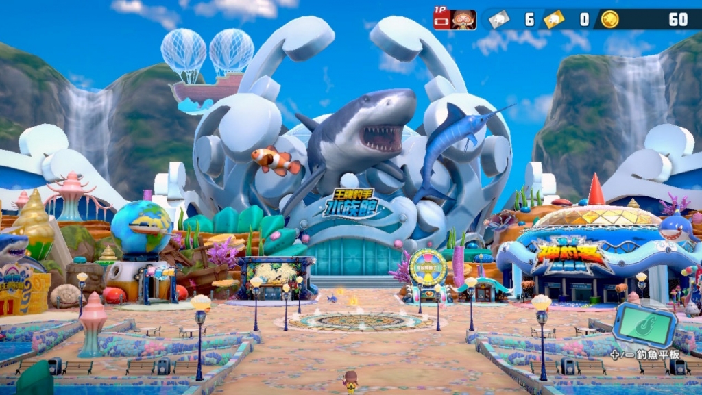游戏模式方面,《王牌钓手 欢钓水族馆》提供了王牌钓手+、毒毒传说、王牌钓手派对、鲨鲨狂热潮、线上神钓客锦标赛五种游乐设施给玩家选择游玩。玩家可以控制小人在地图上移动至每个设施,也可以直接打开钓鱼平板选取移动。每种模式的规则都十分好懂,毕竟还是娱乐性质的作品,所以基本上没有太高的上手难度,萌新玩家也能够轻松体验。