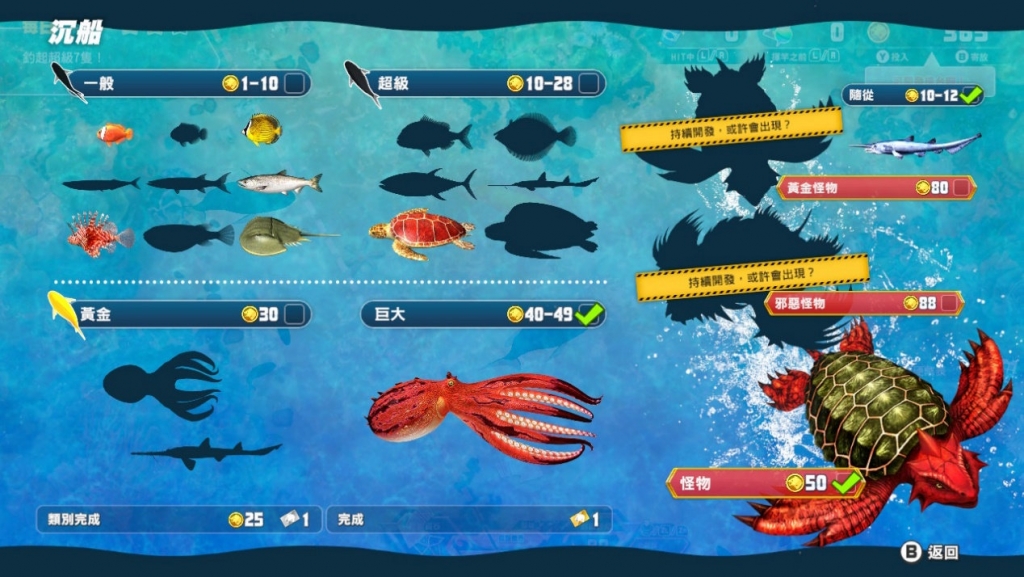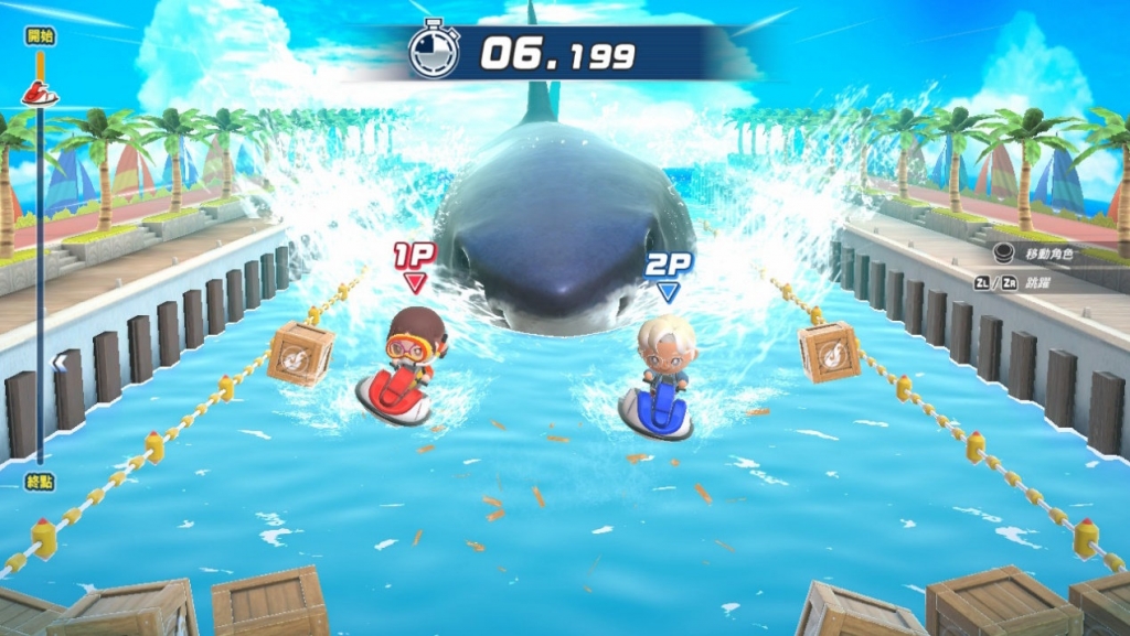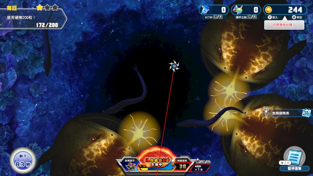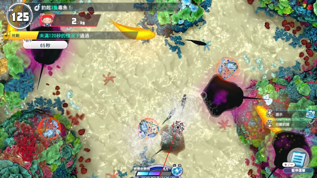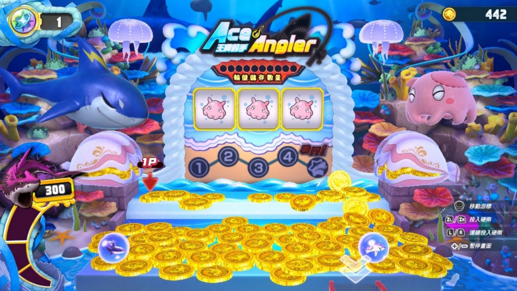 如果此前有玩过《王牌釣手 Nintendo Switch版》的话,那么王牌钓手+应该就难不倒你了。通过投入硬币来购买不同的钓竿,发射至场景中垂钓,当鱼儿上钩后一直按压收线,合适时机使用必杀技(电)增加上钓几率。当然还得根据实际情况来选择钓竿,拿个普通杆钓大鱼显然更多是运气成分了。