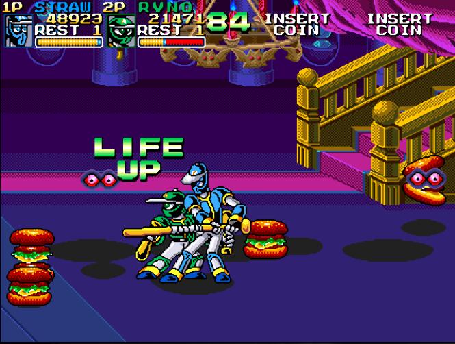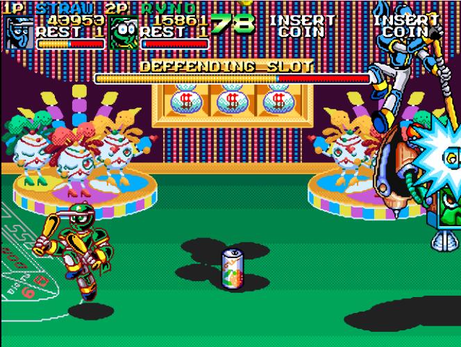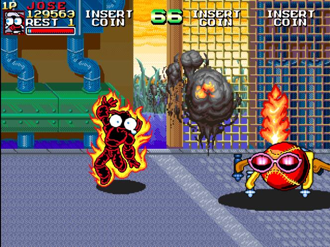 敌方的角色也都是Q版的可爱卡通形象。虽然只有打和跳两个按键,操作也是标准的“快打旋风”类型,不过本作中的招数更加丰富,针对不同的角色有着各自的必杀技:JOSE是冲刺中后+跳,RYNO是空中上下+跳,ROGER是面对敌人后上前+跳,STRAW是后下前+跳,此外全角色都有跳跃中后前+拳的大型召唤技。